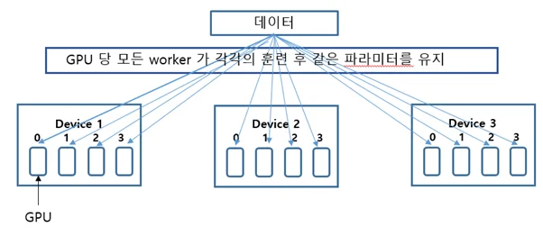 이처럼 worker 는 한번의 반복 마다 경사도를 모두 모아서 변경하므로 모든 worker 는 언제나 같은 파라미터(weight)를 갖는다. 이를 동기(synchronous)방식이라고 하며 비동기 방식도 있으나 설명은 생략한다.