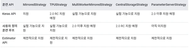 텐서플로우 가이드 (https://www.tensorflow.org/guide/distributed_training)에 명시된 분산 훈련 부분에는 tf.distributed.Strategy 를 tf.keras 나 tf.estimator 와 함께 사용할 수 있다고 설명하고 있다.