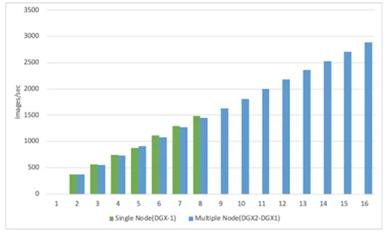 우리 회사 자체적으로 NVIDIA사의 고성능 AI연구용 시스템인 DGX-1(V100 8개 GPU), DGX-2(V100 16 개 GPU)를 대상으로 tf_cnn_benchmark 수행 시 이미지 처리량을 비교한 결과, 아래와 같이 GPU 노드가 증가함에 따라 이미지 처리 성능도 일정하게 증가하는 결과를 확인하였다.