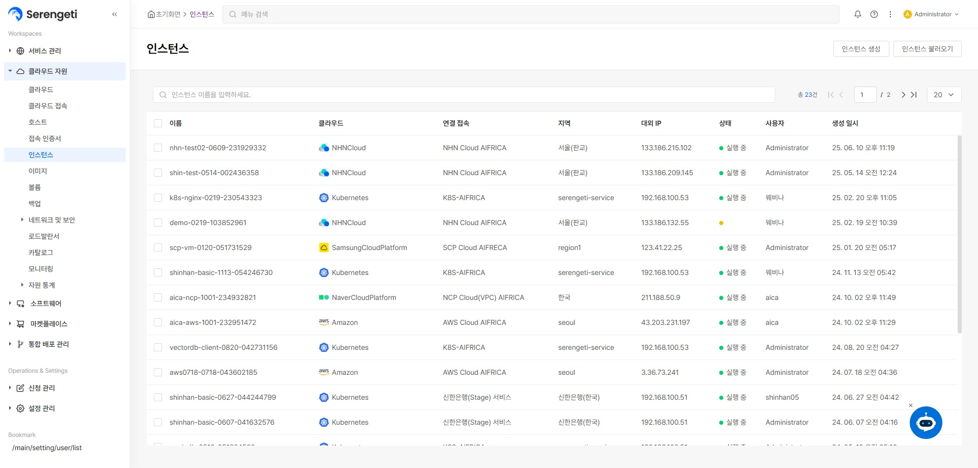 세렝게티 PaaS 화면예시(인스턴스 관리)