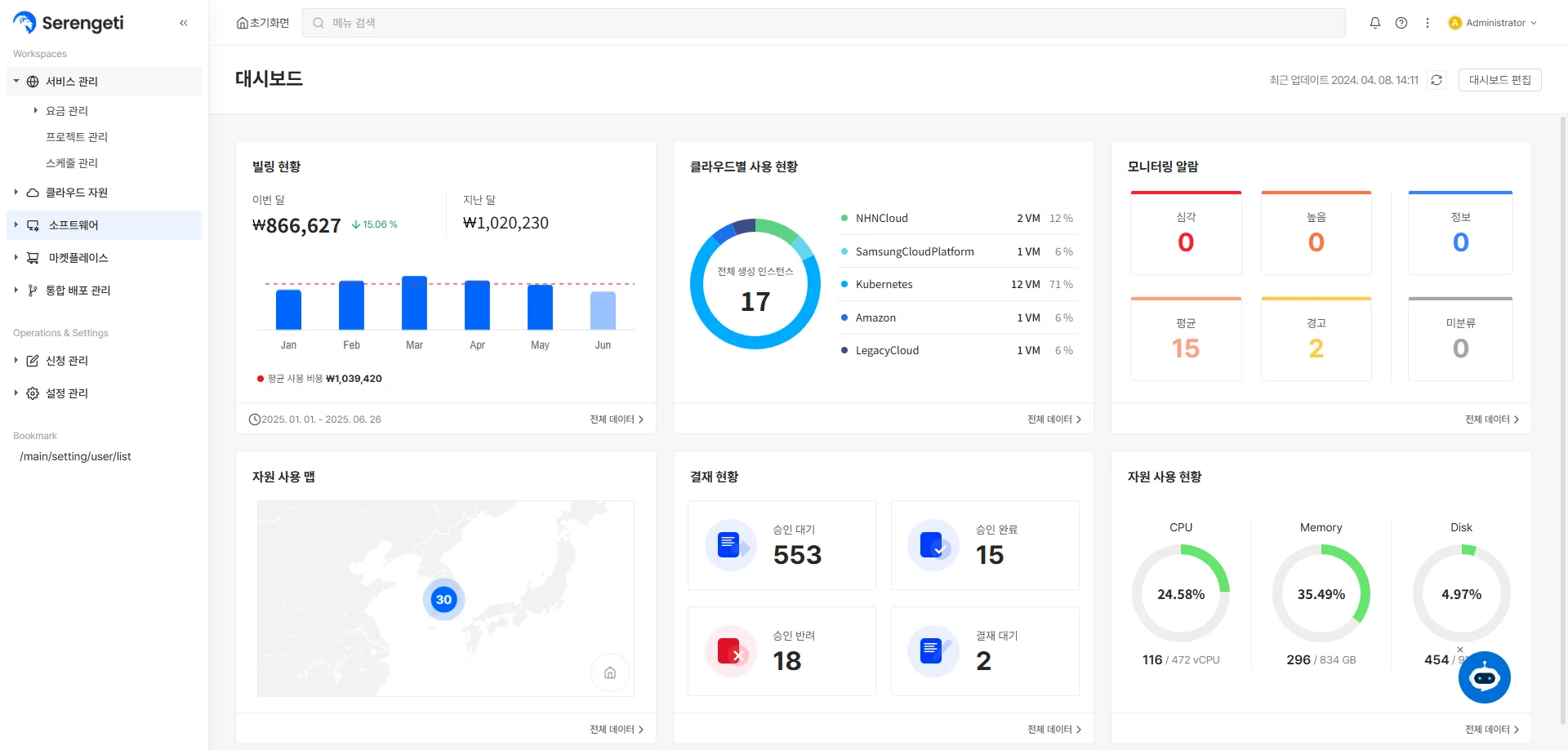 세렝게티 PaaS 화면예시(대시보드)