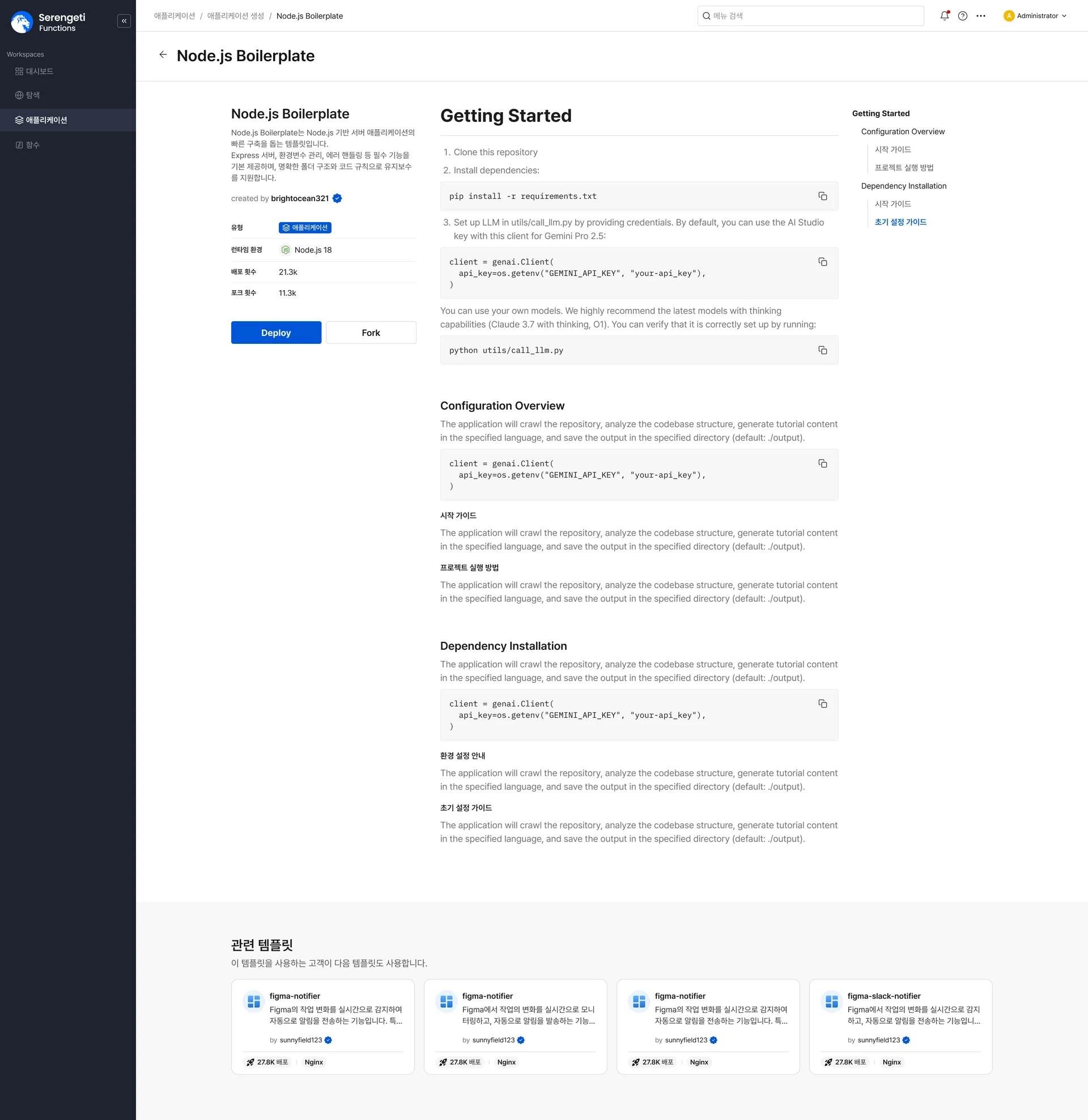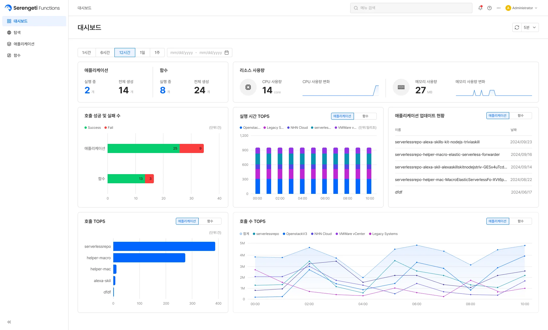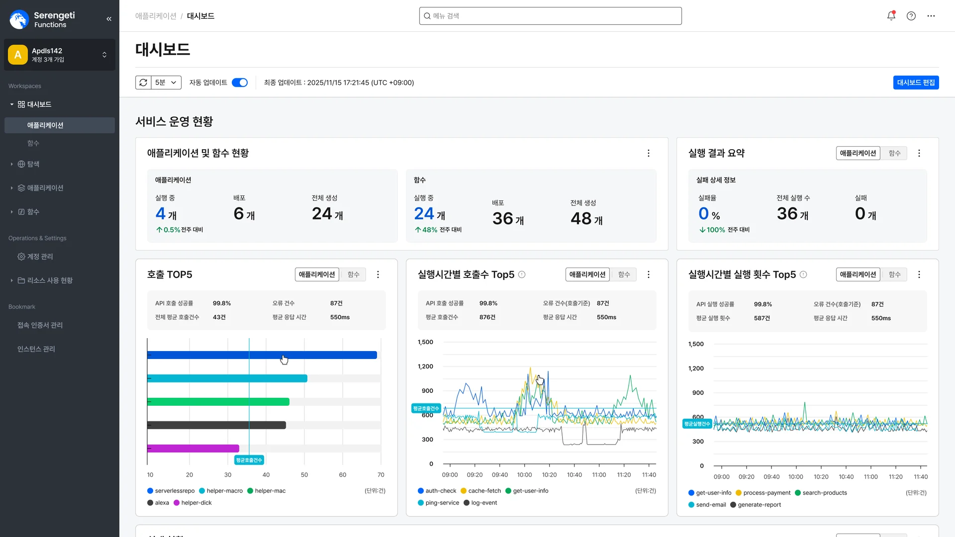 세렝게티 Functions 화면 예시(대시보드)