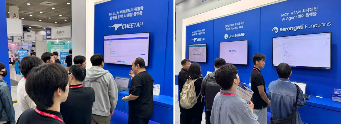 그리고 다양한 API 및 내부 시스템과의 연동을 지원하며, 로우코드 기반으로 에이전트를 빠르게 구현할 수 있는 서버리스 Agent 빌더 플랫폼 ‘세렝게티(Serengeti) Functions’를 중심으로 부스를 구성했습니다.
