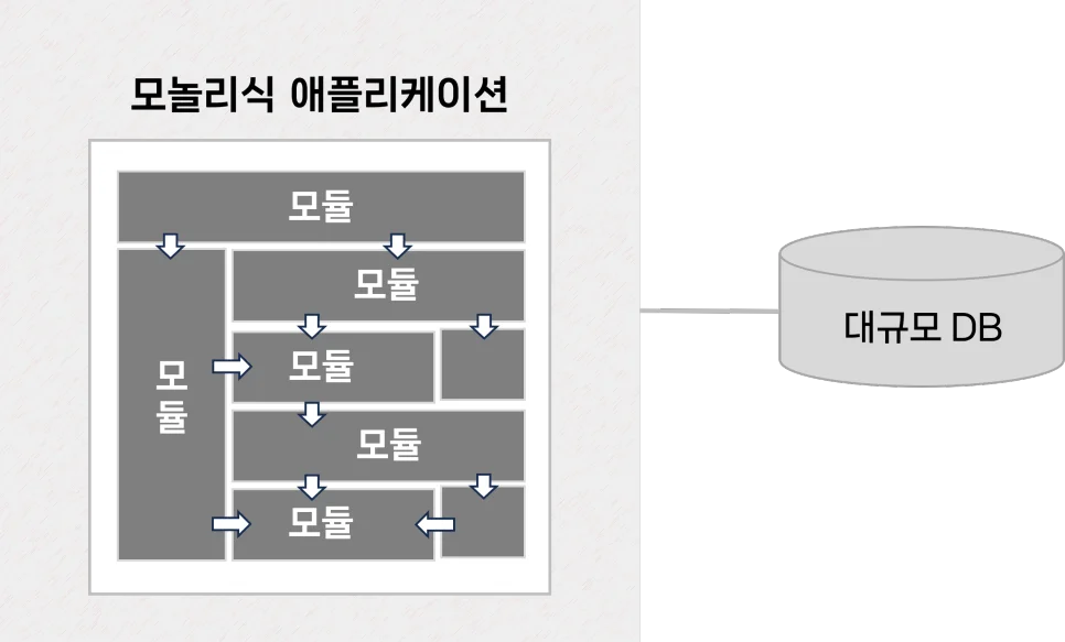 ​모놀리식은 하나의 단일 애플리케이션 내에 기능들이 서로 모듈로 연결되어 있고
