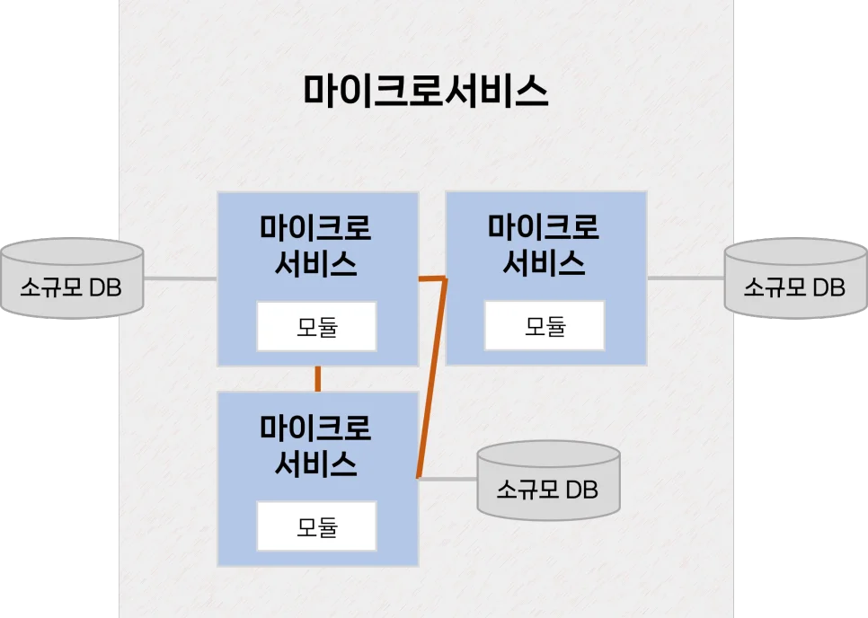 그렇기에 각 기능들이 연계되어 있어 일부 모듈의 변경사항도 전체 애플리케이션 개발/운영 프로세스에 영향을 준다는 단점이 있었죠.