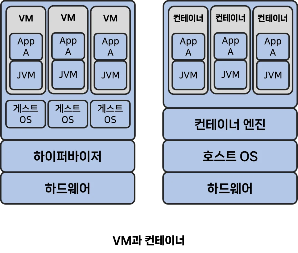 그래서 서로 다른 운영체제 위에 애플리케이션을 올릴 수 있다는 장점은 있지만 용량이 크고 무겁습니다.
