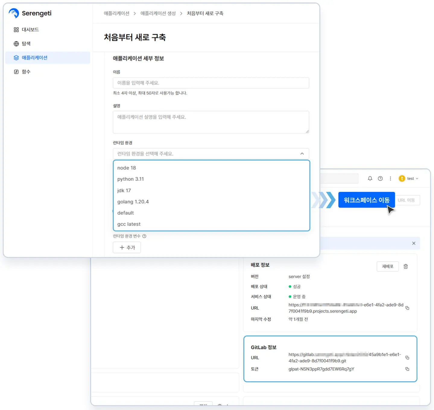 - 웹과 로컬을 유연하게 오가는 하이브리드 개발환경 지원: 간단한 코드는 웹 브라우저상의 Web IDE에서 바로 수정하고 배포하는 것이 효율적입니다. 하지만 코드가 복잡해지거나 협업이 필요할 때는 개발자에게 익숙한 로컬 환경에서 작업하는 것이 유리합니다. 이를 위해 세렝게티는 클릭 한 번으로 프로젝트별 Git URL을 자동 생성해 주고 있습니다.