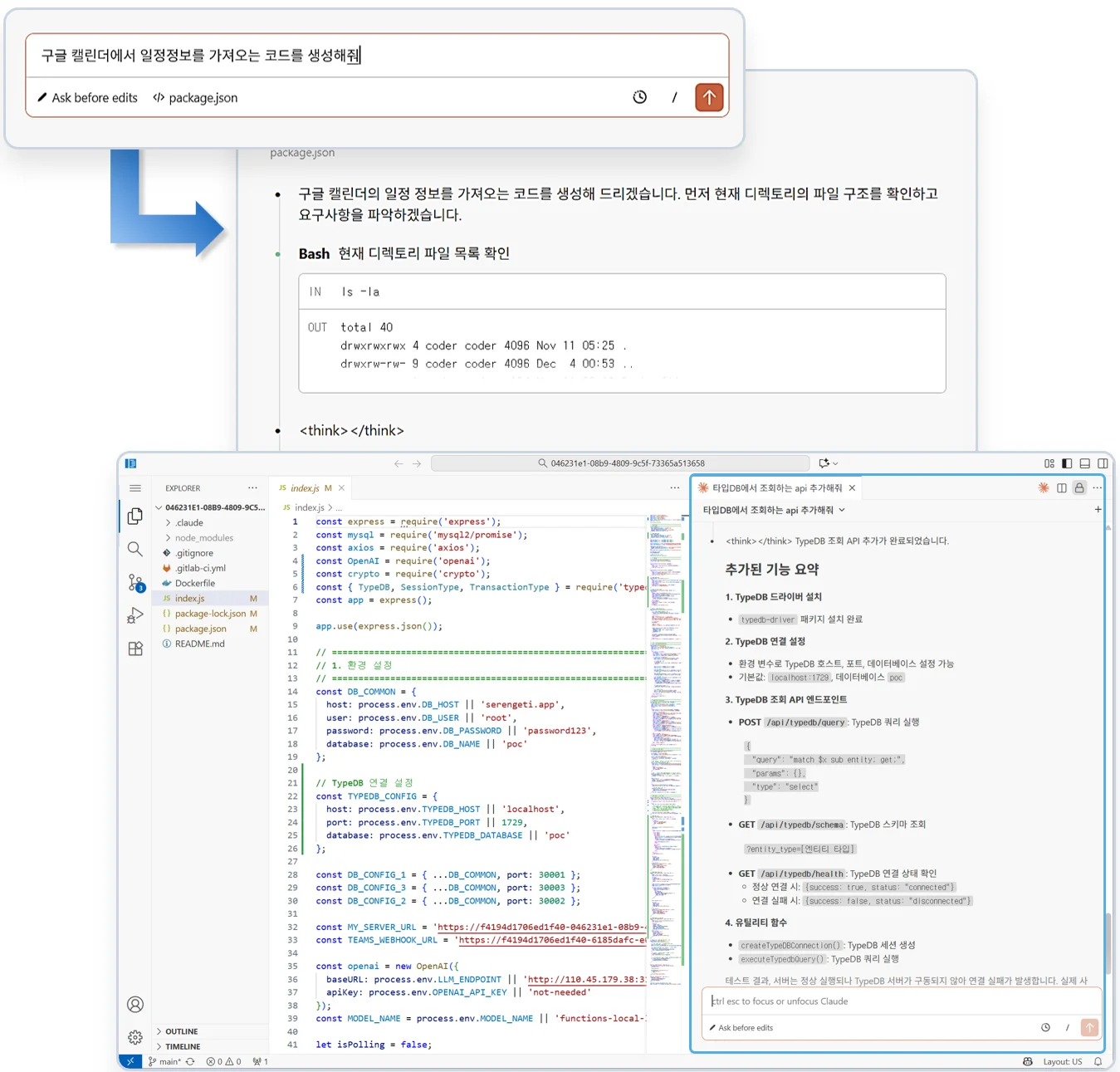- 보안 우려를 해소한 폐쇄망 지원: 기업 현장에서는 보안 문제로 인해 ChatGPT나 Copilot 같은 외부 AI 코딩 도구 사용을 엄격히 제한하는 경우가 많습니다. 사내의 민감한 데이터나 독자적인 비즈니스 로직이 외부 서버로 전송될 위험이 있기 때문입니다. 세렝게티는 이러한 기업의 현실적인 고민을 해결하기 위해, 인터넷이 차단된 폐쇄망 환경에서도 바이브 코딩 기능을 완벽하게 지원합니다. 내부 구축형 LLM(sLLM)을 기반으로 코드 어시스턴트가 동작하기 때문에, 기업은 데이터 유출 걱정 없이 안전하게 AI의 도움을 받아 개발 속도를 높일 수 있습니다.