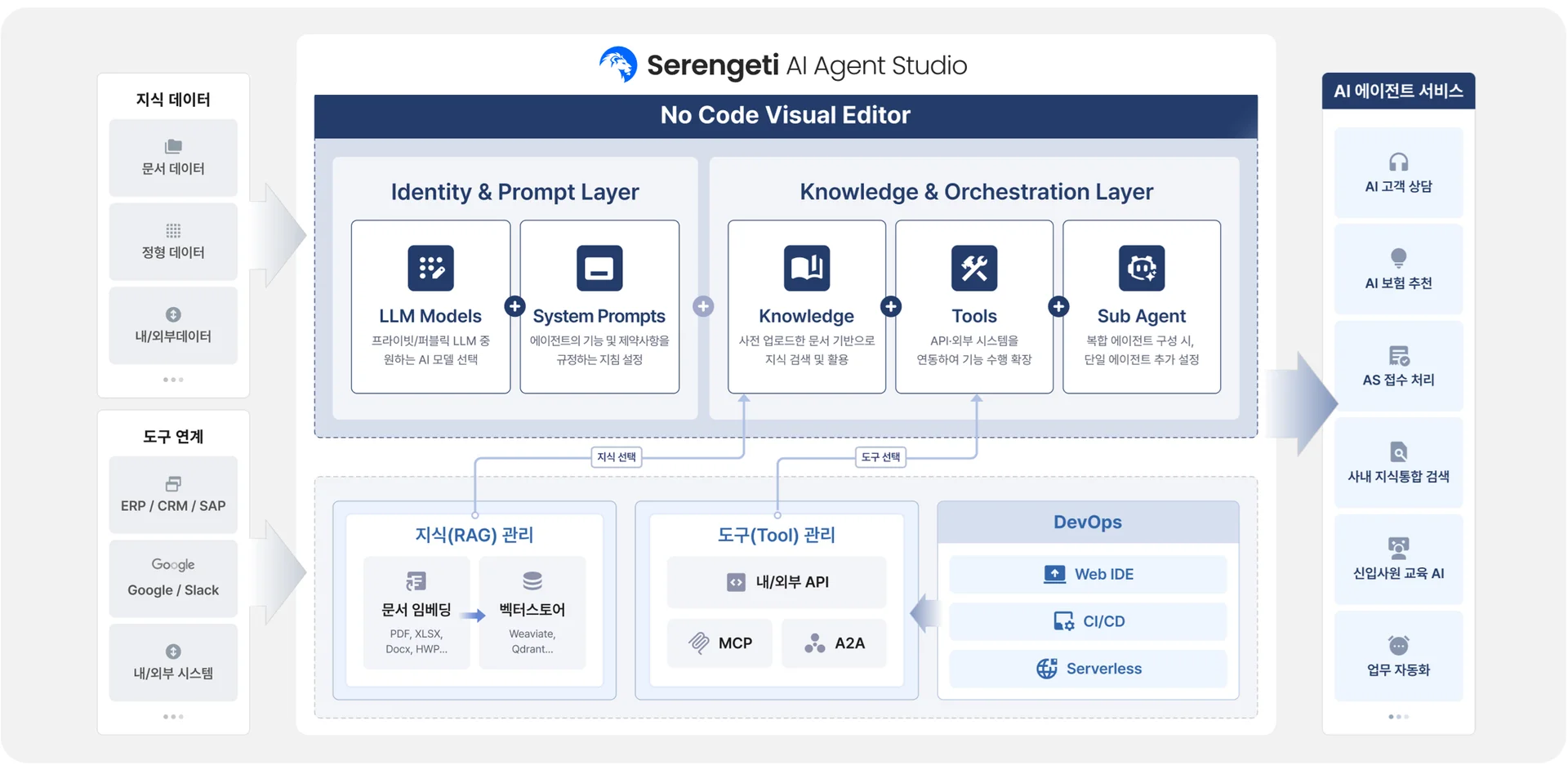 세렝게티 AI Agent Studio는 이러한 준비 과정을 플랫폼 차원에서 미리 해결하여, 코드 작성뿐만 아니라 배포 및 운영까지를 원클릭으로 지원하는 환경을 제공합니다.