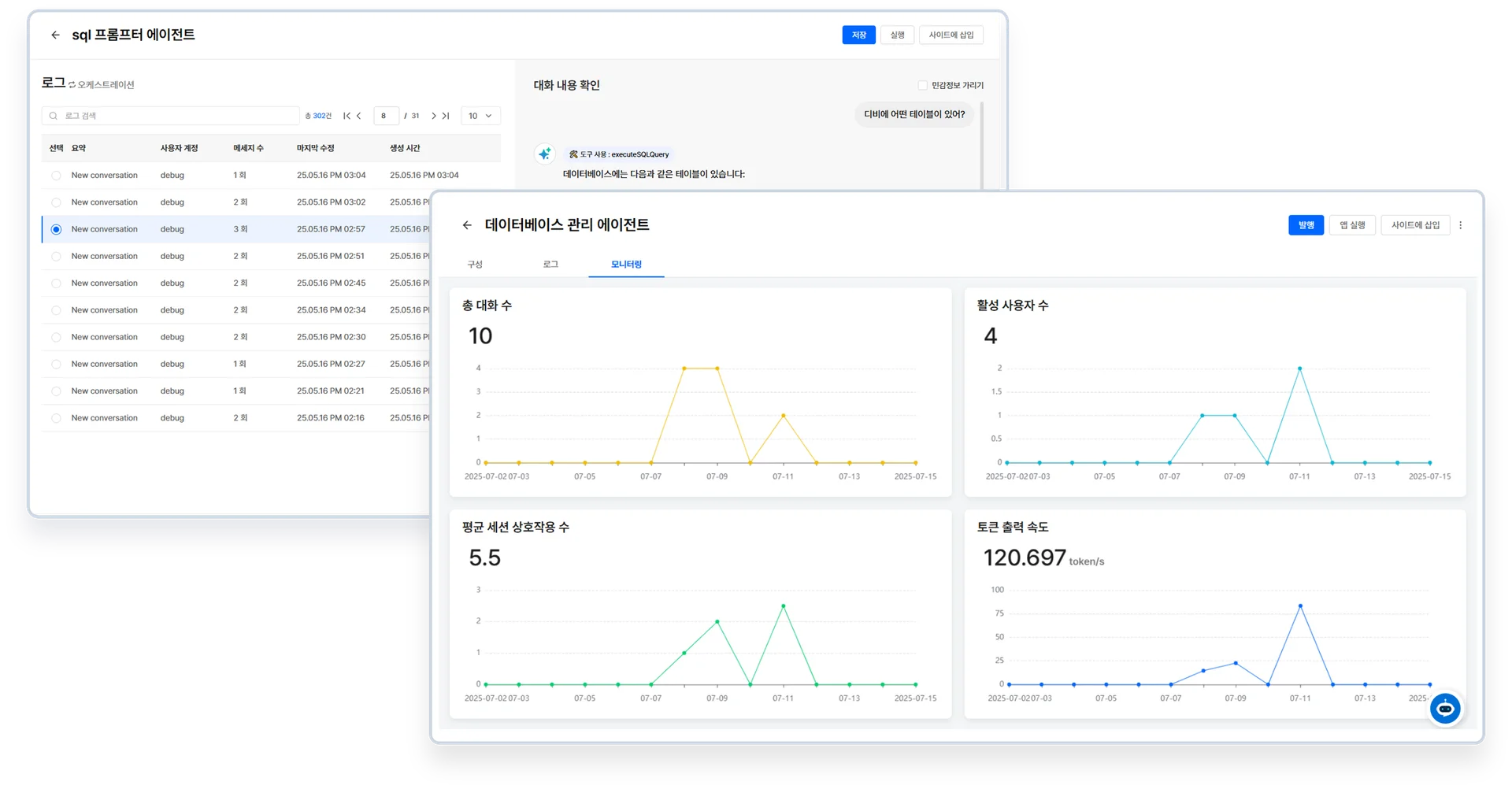 실시간 모니터링: 에이전트의 사용 현황을 직관적으로 파악할 수 있도록 총 대화 수, 활성 사용자 수, 평균 세션 상호작용 수 등의 정보를 대시보드 형태로 제공합니다.