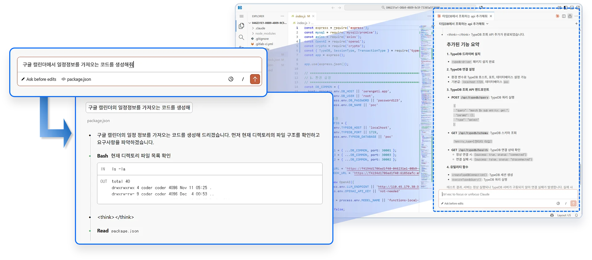 바이브 코딩(Vibe Coding) 지원: 코드를 직접 작성하지 않고 자연어로 의도를 설명하면 AI가 실행 가능한 코드를 생성해주는 바이브 코딩 기능을 지원합니다. 덕분에 전문 개발 지식이 없는 기획자나 운영자도 필요한 도구 함수를 직접 구현하거나, 비즈니스 환경 변화에 맞춰 에이전트의 로직을 즉각 수정하고 보완할 수 있습니다.