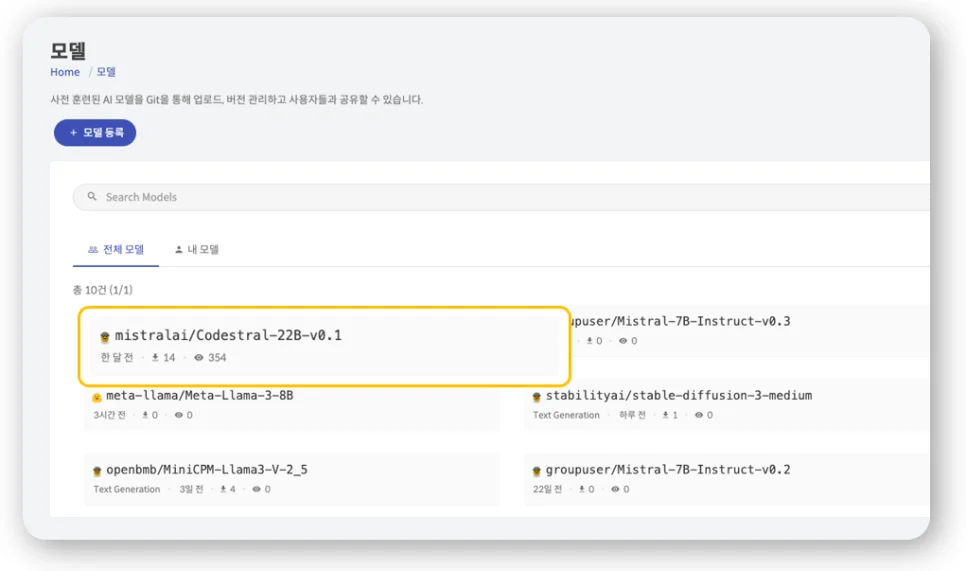 LLMOps를 통한 모델 관리 화면 예시(출처: 에이프리카 치타 LLMOps)