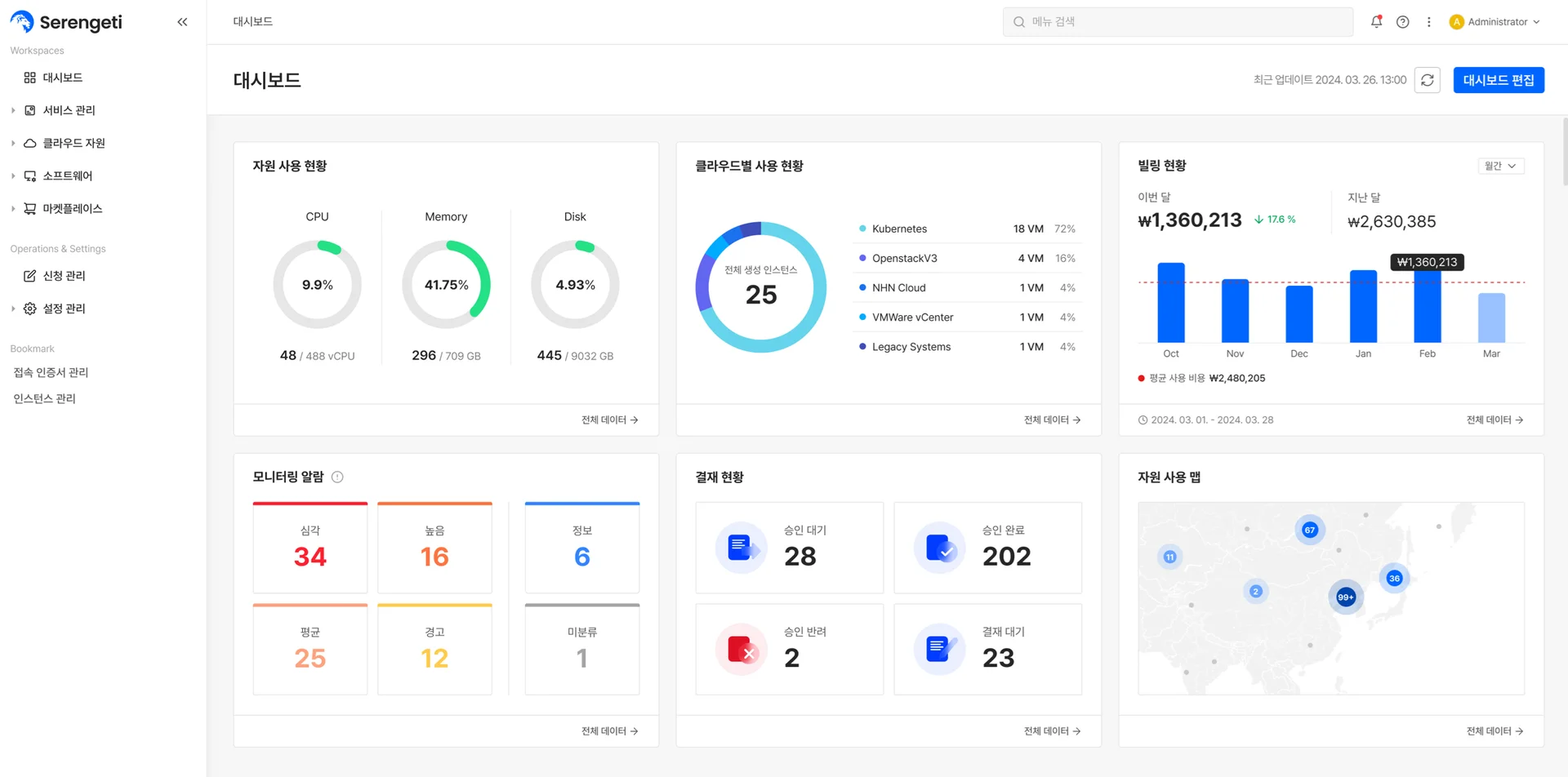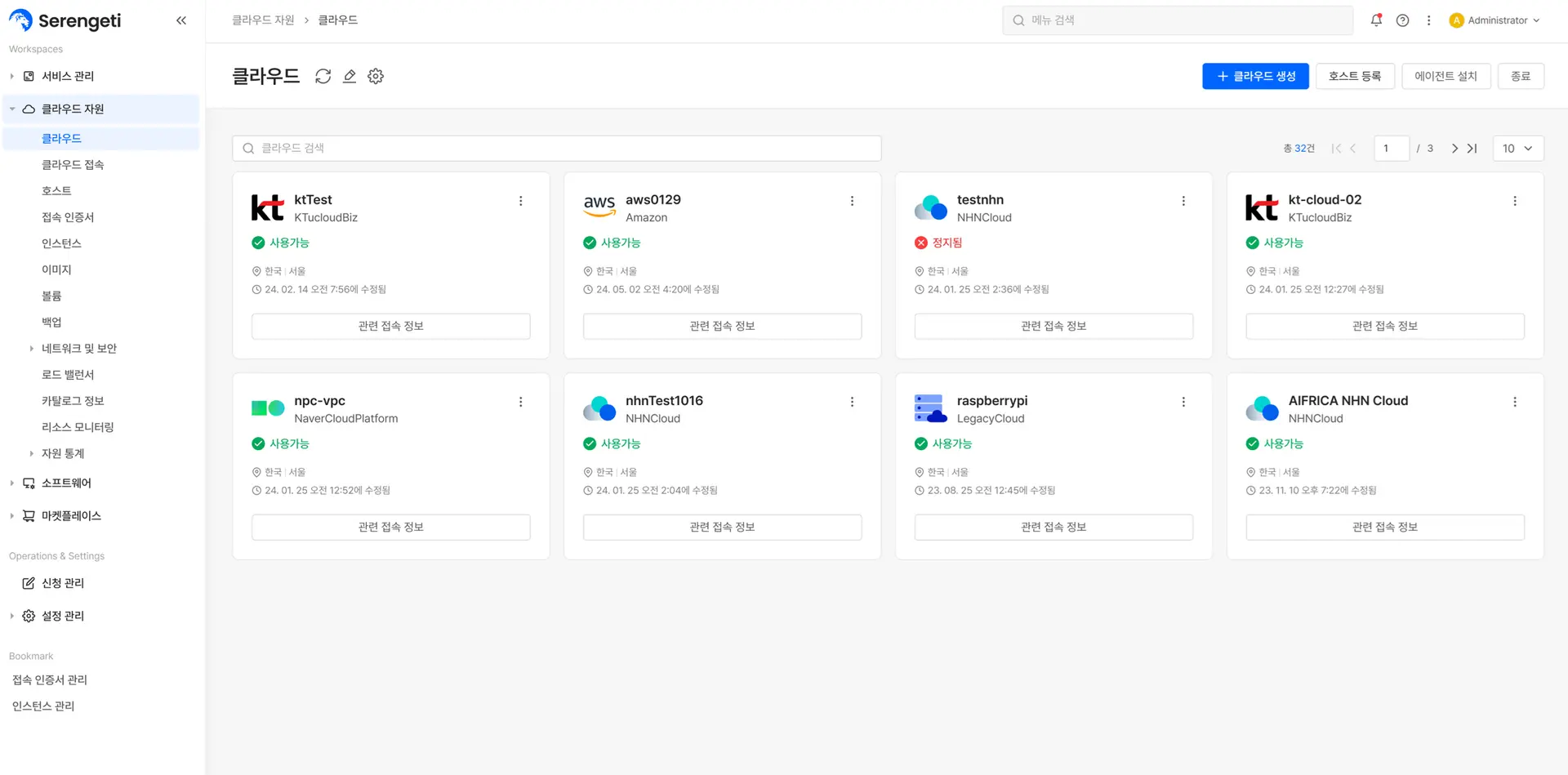 운영자는 클라우드별 정책이나 구조 차이에 얽매이지 않고, 하나의 통합된 시각에서 리소스를 관리하며 장애 대응과 확장 전략을 유연하게 수행할 수 있습니다. 결국 세렝게티 CMP는 복잡한 멀티 클라우드 환경을 단순하고 안정적인 구조로 전환시켜, 기업이 운영 효율성과 안정성, 그리고 확장 가능성을 동시에 확보하도록 돕는 플랫폼입니다.