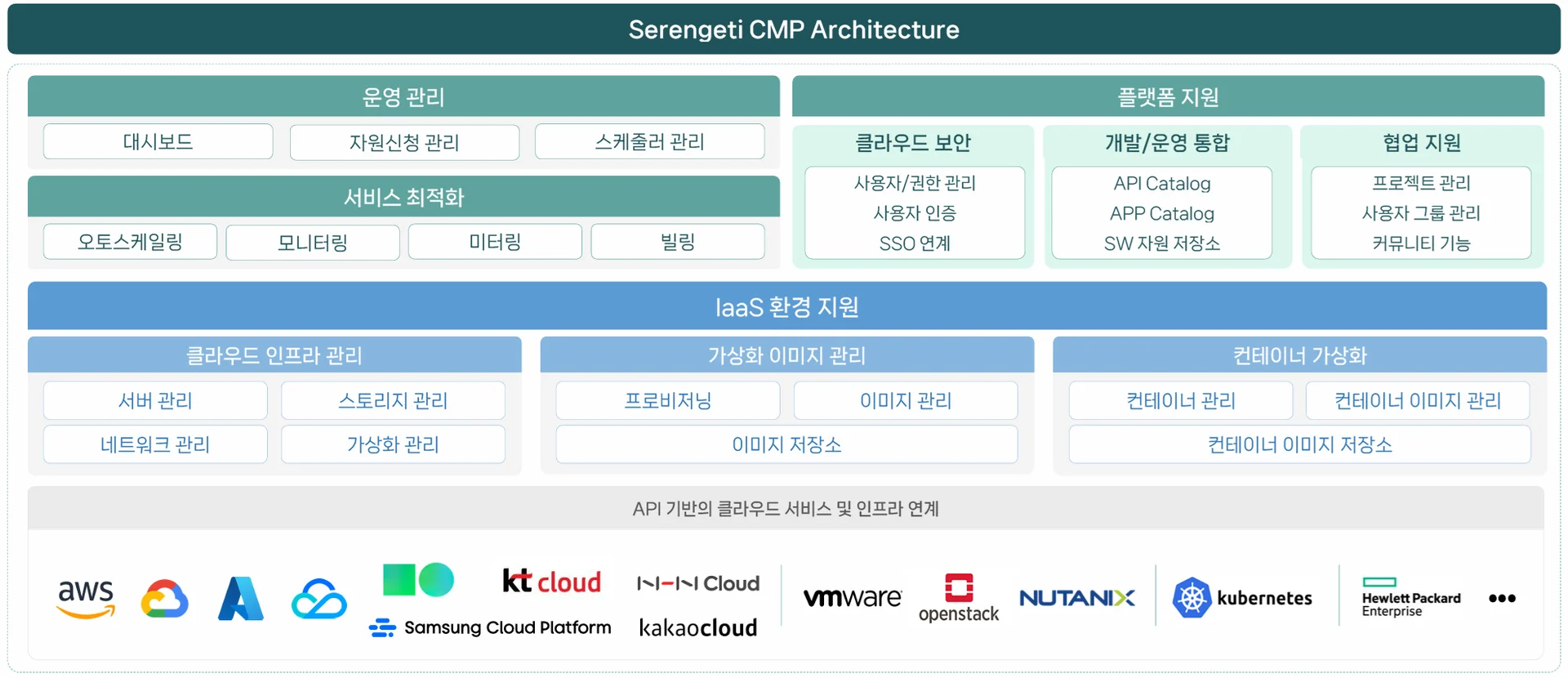 이처럼 세렝게티 CMP의 ‘통합관리’란, 단순히 여러 클라우드를 한 화면에 나란히 두는 것이 아니라, 서로 다른 클라우드가 하나의 플랫폼처럼 유기적으로 작동하도록 만드는 것을 의미합니다.